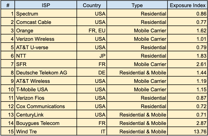 For this section, we zoom out a bit from the granularity we have presented so far and single out some ISPs and mobile providers. We curated the list below by sorting in order of most incidents for the time frame provided.