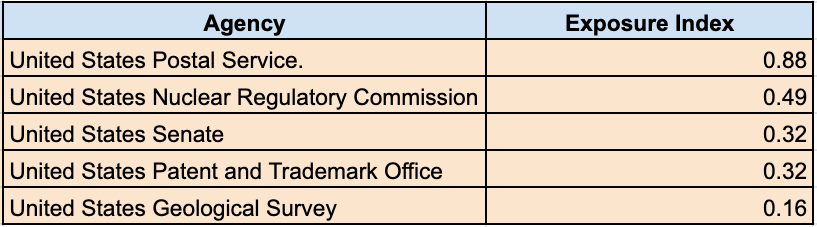 We can dive right into the data and take the top 5 government networks ranked by number of malvertising incidents during our time frame. Here are they are ranked by exposure index:
