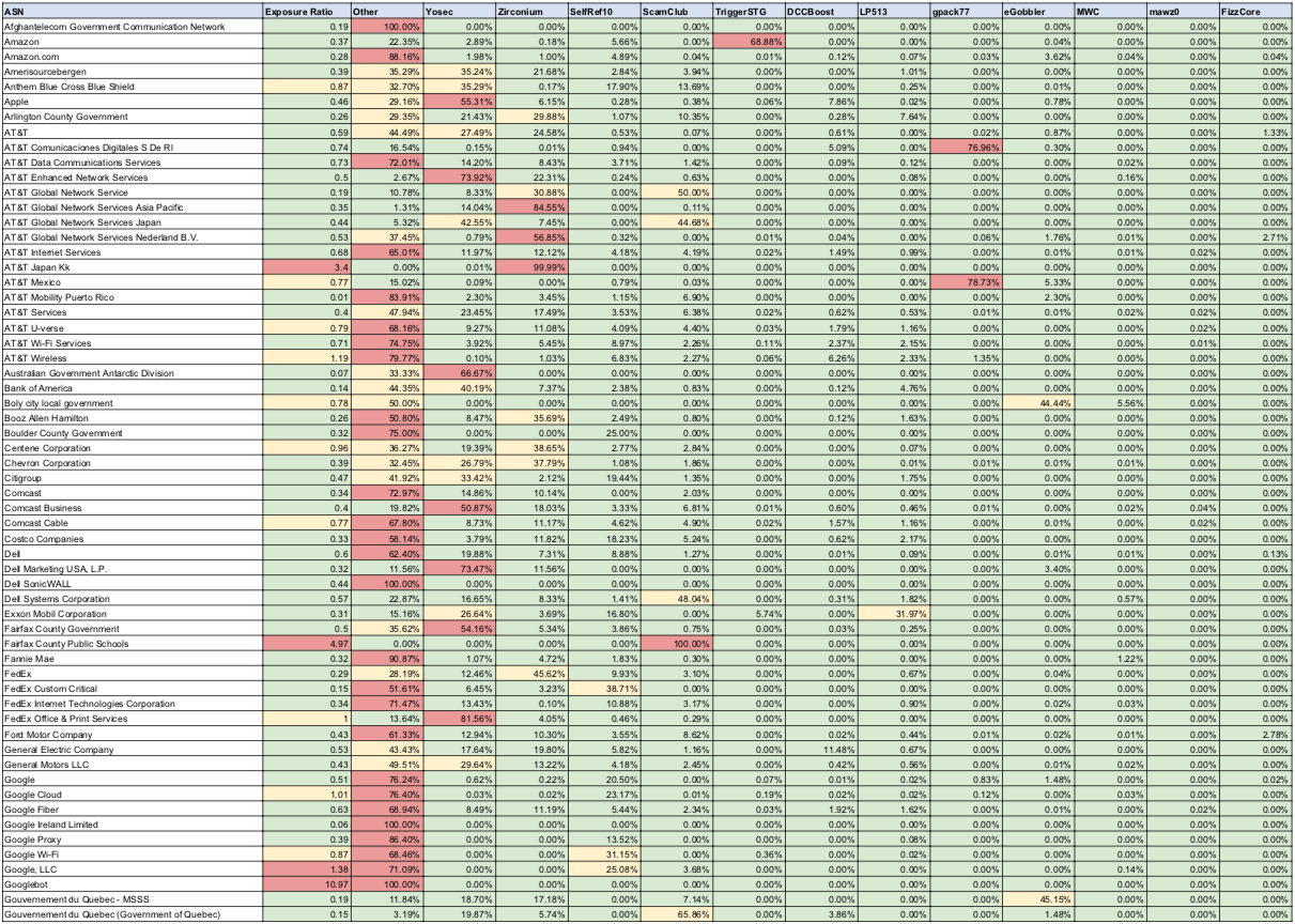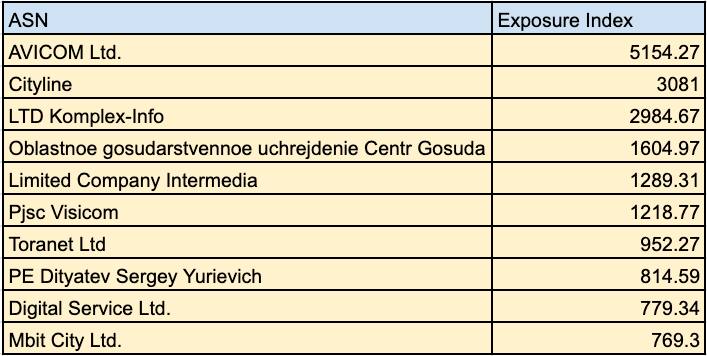 Then there are the confusing anomalies that sorely stand out. Provided below are the top 10 ASNs with over 1000 incidents ranked by exposure index. The majority of these based out of Russia and if we were to create pie charts for these, it would be a solid blue circle with 100% unattributed incidents.