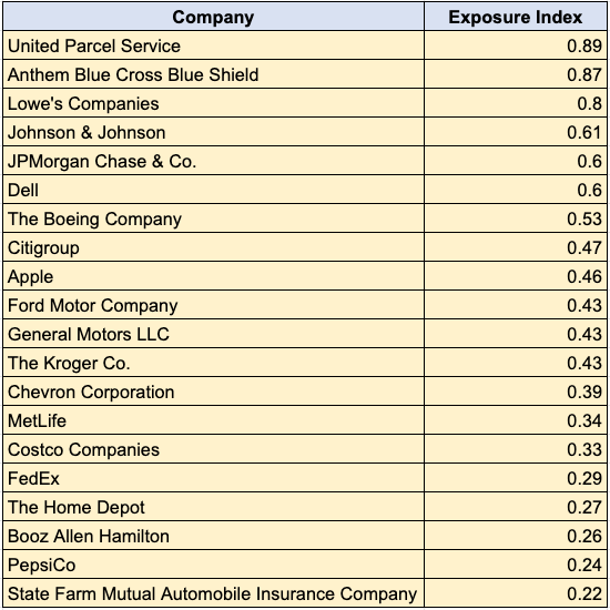 For this section, we have singled out a variety of Fortune 100 companies, as well as a few household names. Again, our findings present that all of these major businesses have an exposure index that’s below average. It’s a refreshing finding, but not entirely unexpected.