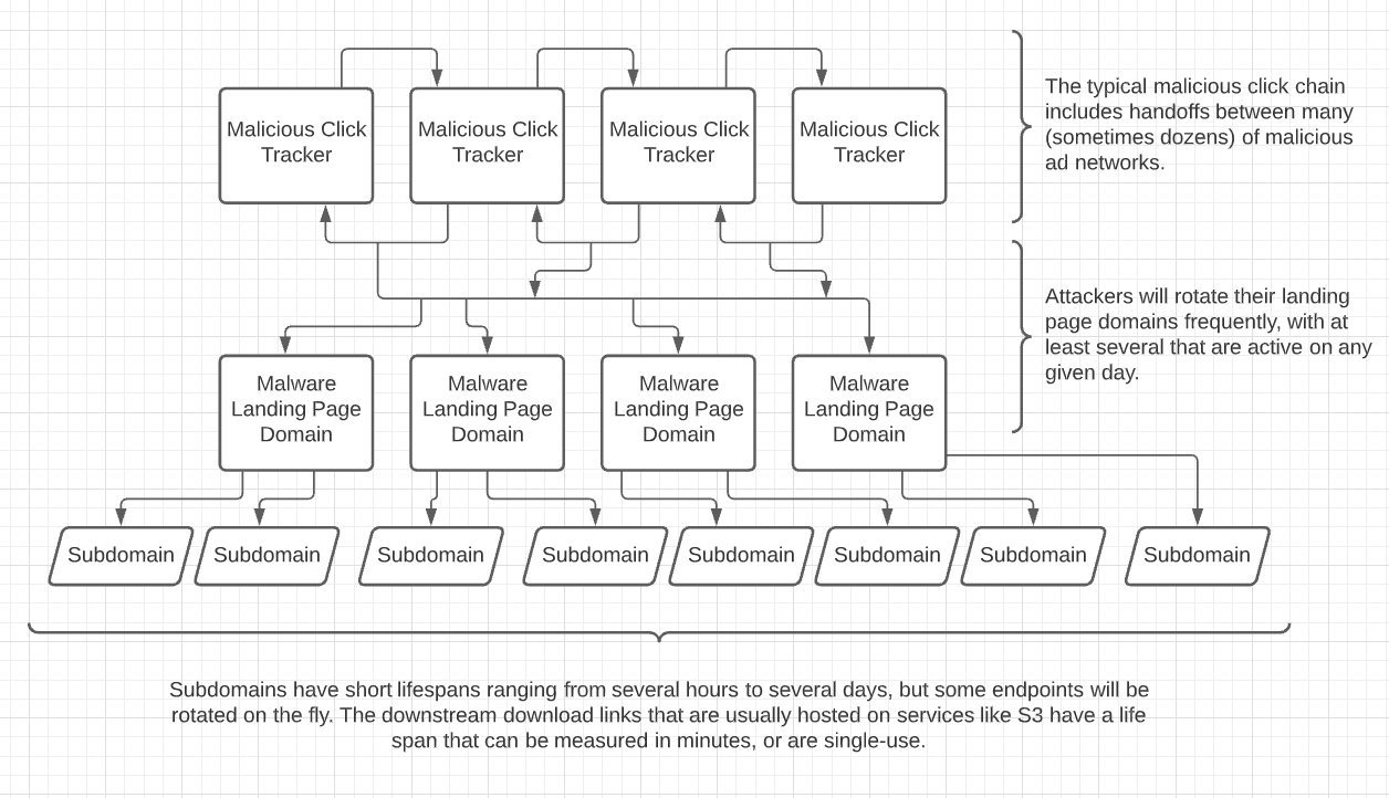 We find that real time analysis of malvertising chains is quite critical in the discovery of central points of infrastructure for these malicious campaigns that can be addressed more reliably. Usually these are pre-landers or campaign ID’s on unsavory ad networks that have malware affiliates on their networks.