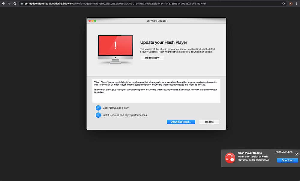 The screenshot above and variations like it are probably familiar to anyone who has been online in the last 15+ years. Despite Flash having been on the decline for years and officially sunset as of 12/31/2020, landing pages like this are without question the most common vehicle for the spread of malware variants like Shlayer and Bundlore, both of which we have covered pretty extensively:
