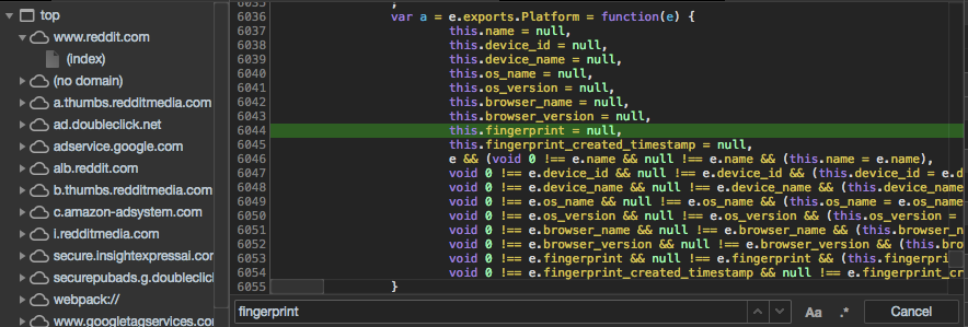 Here at Confiant, we see this specific library surface through thousands of ad impressions daily, while tens of thousands of ad impressions every day leak the presence of some sort of fingerprinting code. In fact, next time you’re on your favorite website, chances are that if you open Chrome Dev Tools and search all files for the keyword “fingerprint”, there’s a good chance you’ll find some tracking code that’s either surfaced through an ad or analytics platform. Don’t be surprised if you see a reference to a canvas object in the same code base either.