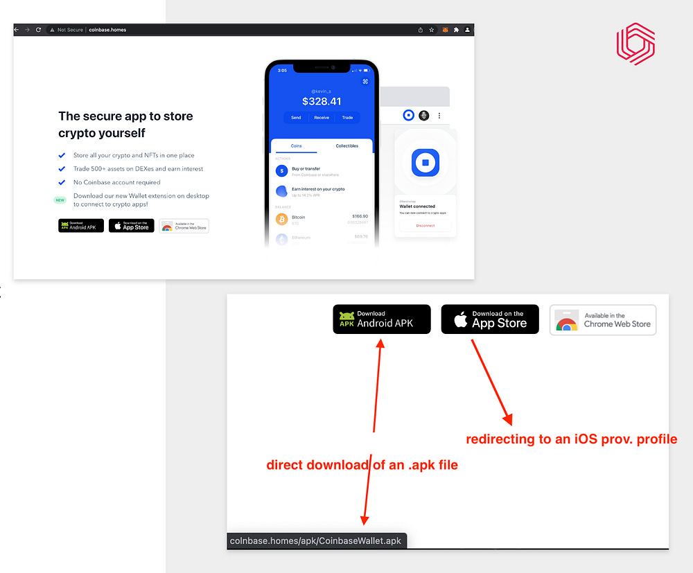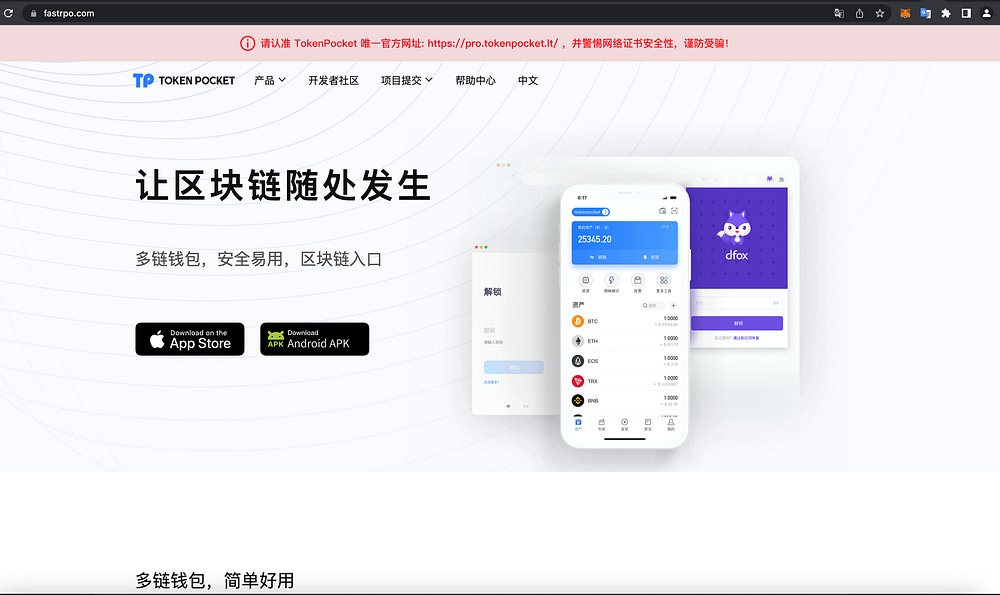 SeaFlower also takes care of the app distribution phase by setting up fake cloned websites where these backdoored wallets can be downloaded. The identified websites are perfect clones of legitimate websites, offering download links: