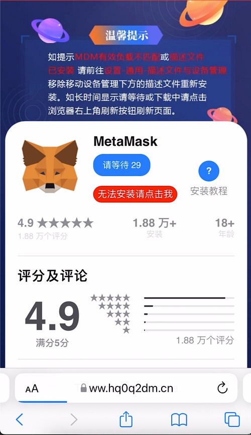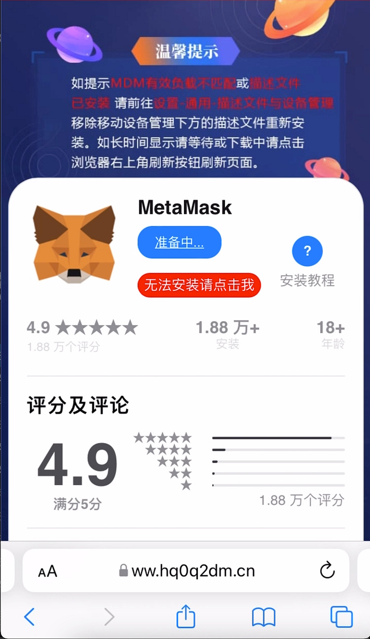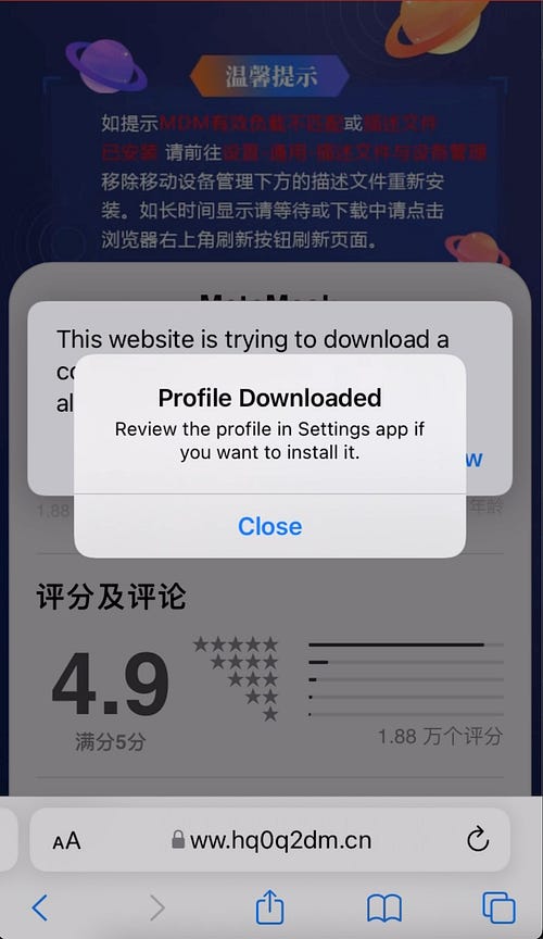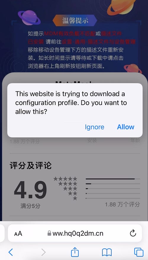 We searched for “download metamask ios” and one of the baidu links on the first results page redirected us to token18[.]app website, which was SeaFlower Drive-by download page, sweet!