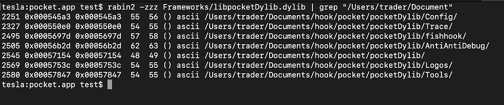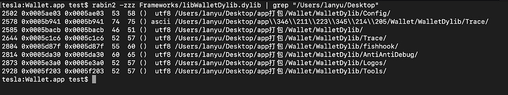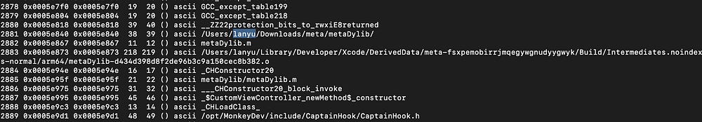 Dumping the strings, we found the same author macOS username “lanyu”, as in the metamask Wallet iOS app, confirming we are dealing with the same author, and also confirmed the usage of the same Monkeydev xcode templates: