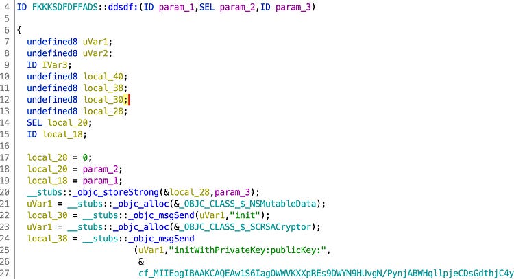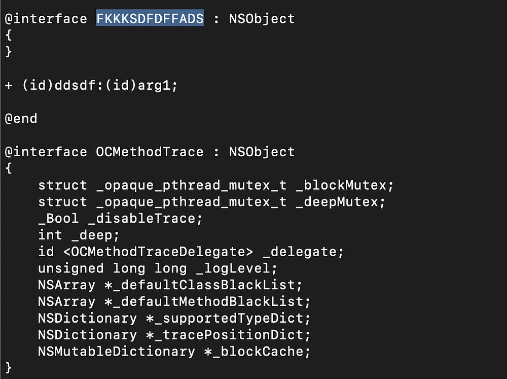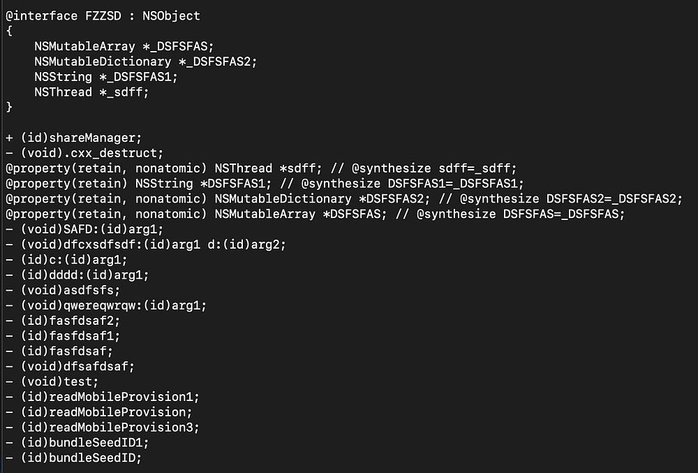 After several checks identifying where a backdoor code could be injected I started looking at the injected libraries, and ran the usual class-dump on the libmetaDylib.dylib revealed a weird class name FKKKSDFDFFADS, highlighted below: