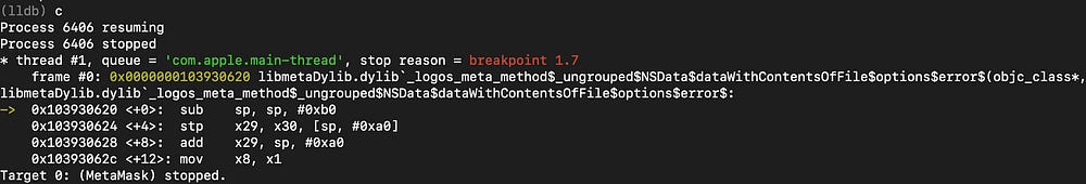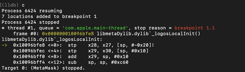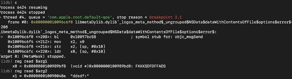 As with any backdoor code found, it is important to validate it at runtime. I installed the backdoored metamask app on a real iOS device, ran debugserver on iOS and waited with LLDB on my laptop to break right after the app is launched. I set a conditional breakpoint to break into anything “logos” :