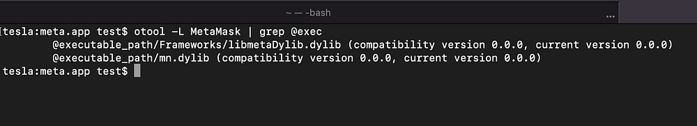 So I started looking at the MetaMask compiled Mach-O file, and noticed two injected .dylibs :