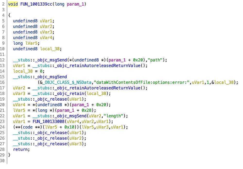Going back to the initial Mach-O MetaMask there’s a reference to dataWithContentsOfFile:options:error at the function 0x1001339cc: