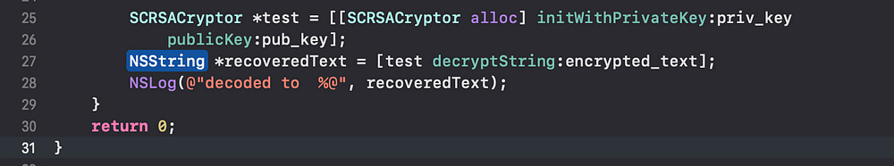 so I just created a project in xcode, extracted the b64 encrypted blob and the RSA keys, linked it to this library, and wrote the following code snippet to decrypt the blob:
