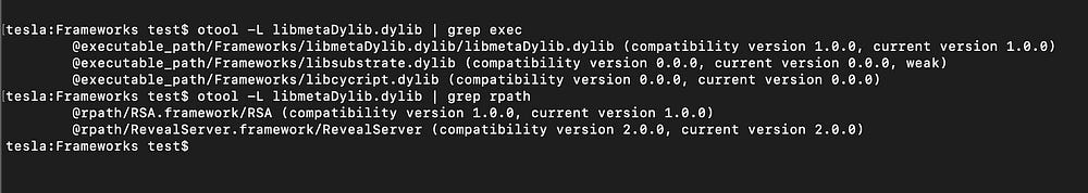 libmetaDylib.dylib contains references to 3 known modding/hooking frameworks: Cycript, Cydia Susbtrate, and the Reveal Framework. This is already a red flag, meaning that something has been done to alter the runtime behavior of the app: