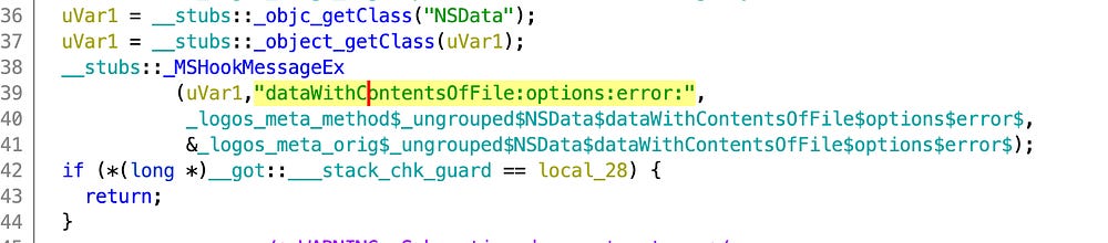 At this point a malicious dataWithContentsOfFile:options:error implemented by the author will get called right before the original one. The malicious dataWithContentsOfFile:options:error contains the following code: