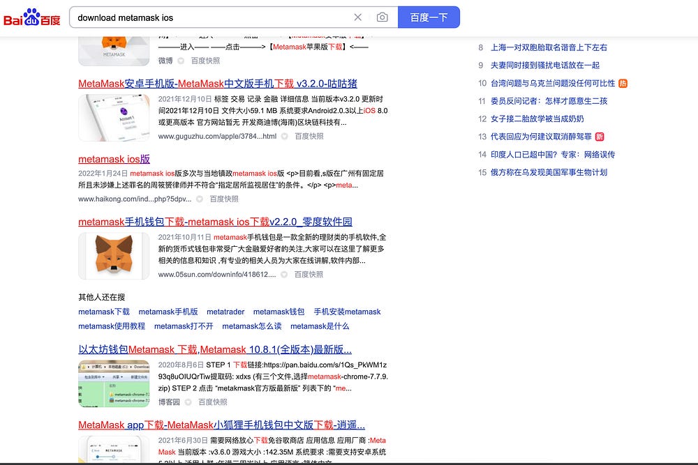 Baidu, Inc is a Chinese multinational AI technology company with a search engine. We were interested to see if there’s any SEO or targeting to coinbase or metamask users in that search engine.