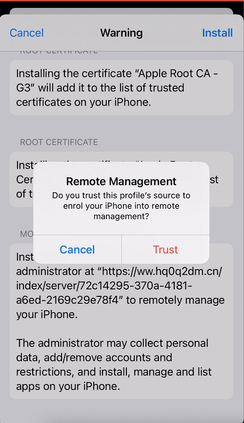 For iOS, SeaFlower is using provisioning profiles. Once installed, the iOS apps are then sideloaded to the victim’s phone and installed. Below are some of the steps we recorded of typically what the victim will see when browsing one of the SeaFlower websites using an iPhone: