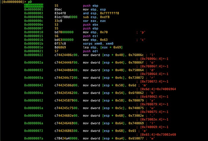 Loading the shellcode in radare2 we can already start seeing some important indicators near the entry point address: