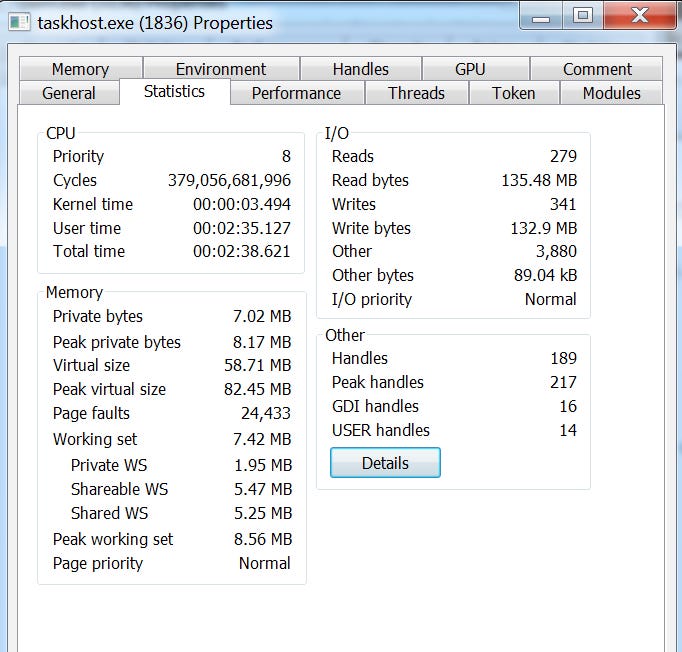 We can already see a huge amount of CPU cycles and read/writes IO’s (beside taskhost.exe consuming 50% of the CPU..)