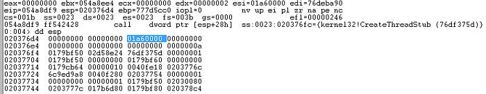 We have different breakpoint options here to dump the loaded shellcode unmodified, we can set a breakpoint on CreateThread() and dump the memory pointer in the third argument which is the memory area containing the shellcode, in our testing environment it was at 0x1a60000: