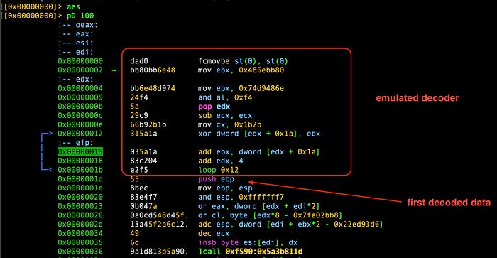 With radare2 we can start emulating the first instructions via the command ‘aes’. We continue emulation until we see the loop instruction that is part of the shikata_ga_nai XOR decoding routine: