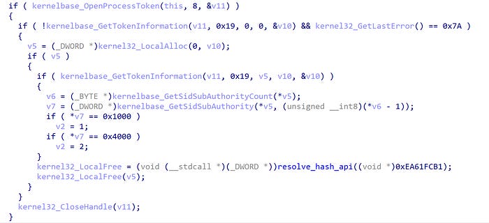 Get the current process integrity levels via subsequent calls to: OpenProcessToken, GetTokenInformation,GetSidSubAuthority, as seen in the decompiled code below: