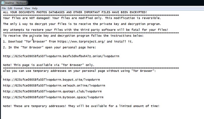 Finally, a ransom note is loaded after the completion of the encryption process or when users tries to kill the infected taskhost.exe process manually: