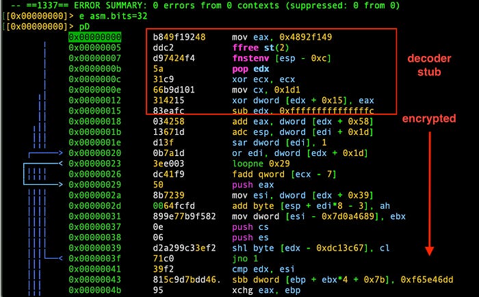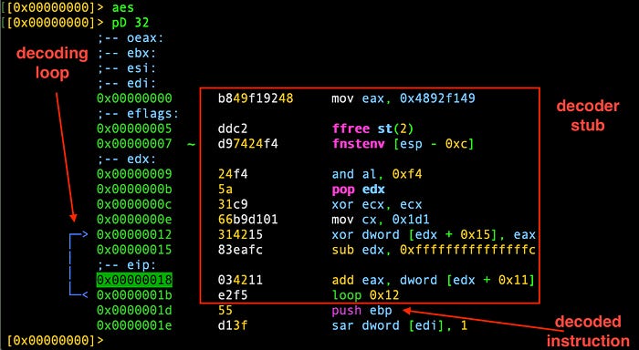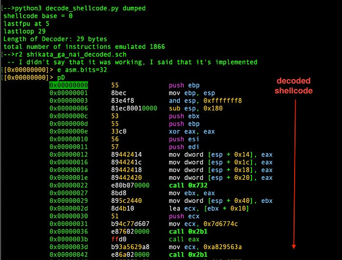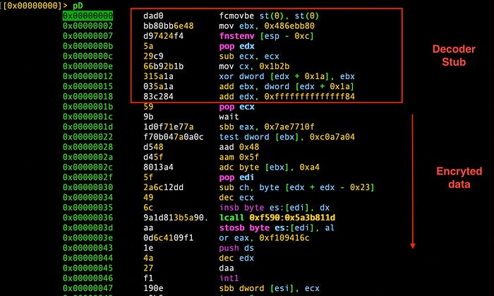 We will use radare2 and its ESIL virtual machine stack for emulation. We will have to take care of a special scenario as ESIL doesn’t speak FPU instructions so the Shikata ga nai “get EIP” technique with fnstenv will not work if emulated.
