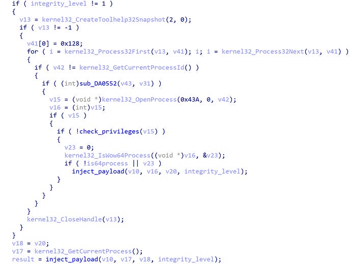 If the current process have anything different than Low Integrity level (for example Medium, High or System integrity level) the shellcode will loop through running process and will inject in those with Medium or High Integrity levels: