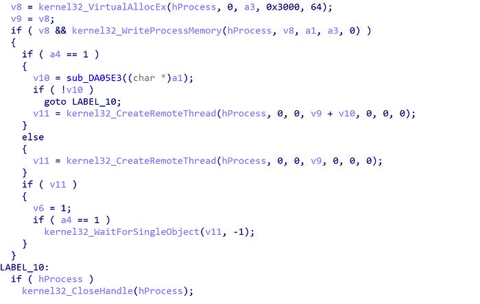 Finally the process injection mechanism used by this shellcode is via WriteProcessMemory in the target process where space is allocated via VirtualAllocEX and then the payload will be executed via CreateRemoteThread: