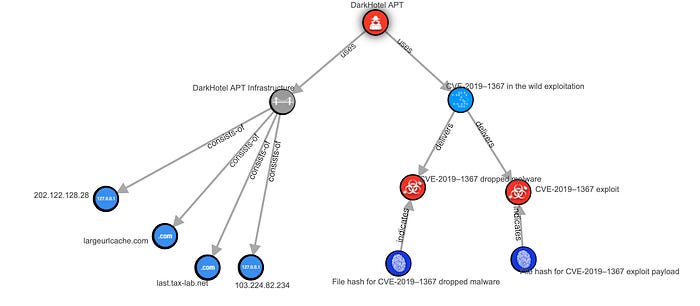 STIX v2.1 graph of DarkHotel APT exploiting CVE-2019–1367 (jan-jun2020)