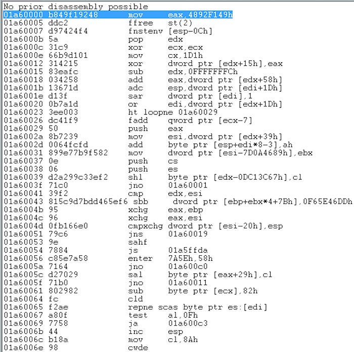 At this point our assumptions were correct and we confirmed that Shikata ga nai was used. Now we have to get rid of it via emulation.