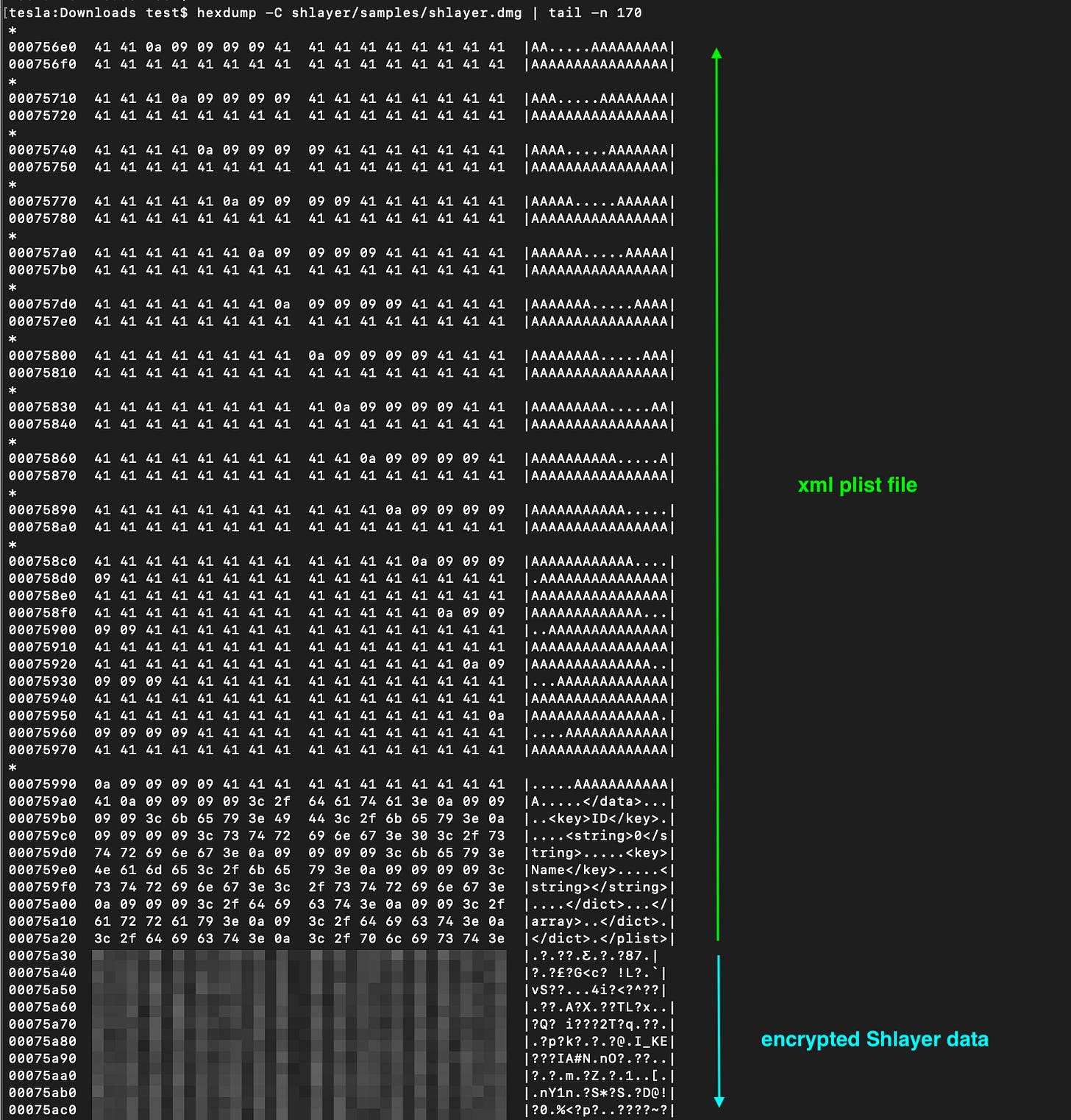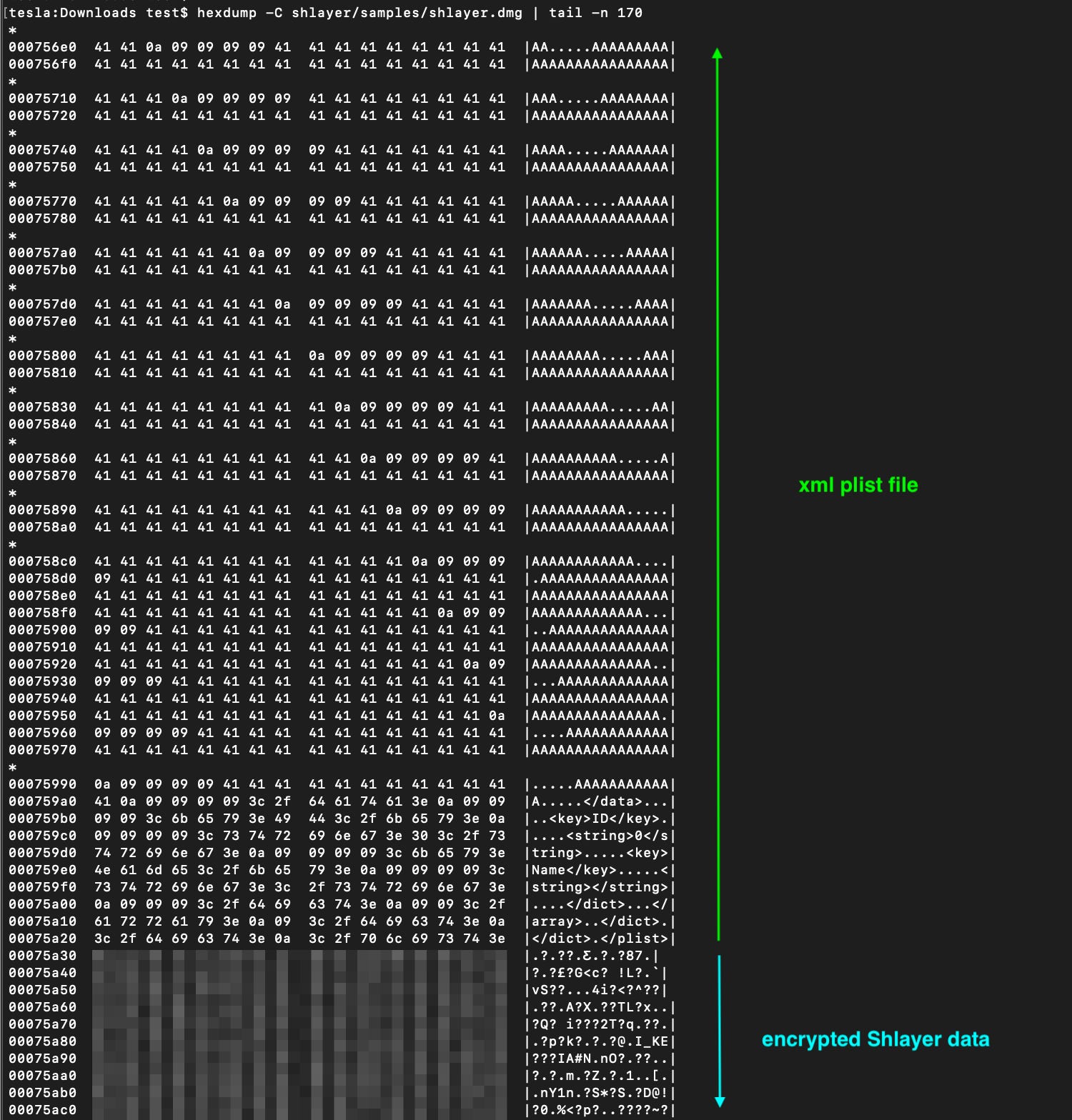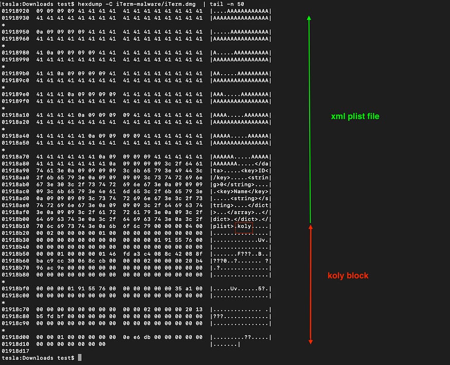 Now let’s pick a modified DMG of a Shlayer malware and check the differences, and we can notice a blob of encrypted data was inserted between the plist file and the koli block (I blurred the blob hex bytes because as we will see later, the Shlayer config could contain identifiable victim information)