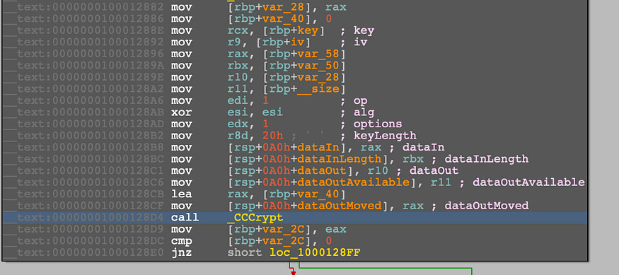 After reversing OSX/Shlayer.F and locating the config decrypting code _CCCrypt is used with kCCAlgorithmAES128 algorithm to decrypt this data, right after extracting the AES key and IV.