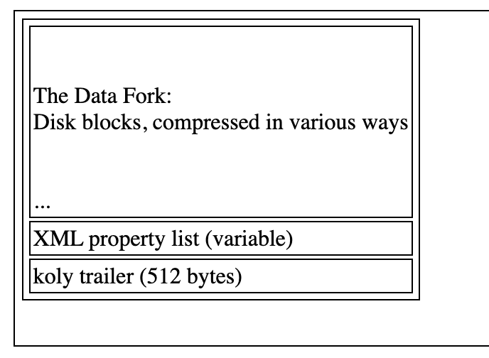 followed by a XML property list (plist) : This property list contains the DMG block map table. it is technically the resource fork of the DMG.