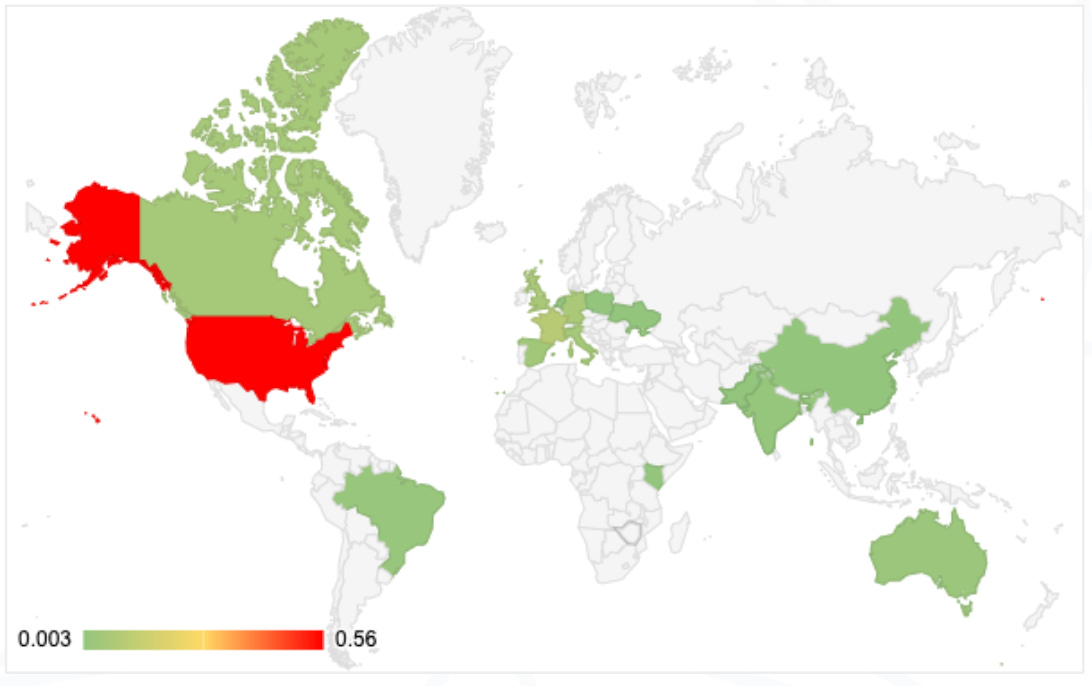 After analyzing a public corpus of OSX/Shlayer.F present in online repositories, we found that in the config, the field du (corresponding to the final recorded download url and its specific parameters) sometimes a parameter client_ip was present with the victim IP address. This allowed us to draw a map of previous OSX/Shlayer.F infections during Q1-Q3 2022: