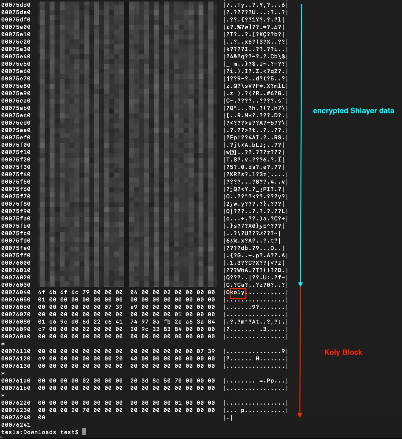 followed by a 512-byte trailer at the end of the file. This trailer is identifiable by a magic 32-bit value, 0x6B6F6C79, which is “koly”. we will call it the “koly” block in this blog post.