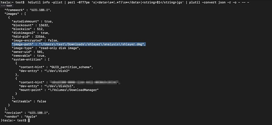 hdiutil info -plist | perl -0777pe ‘s|<data>\\s*(.*?)\\s*</data>|<string>$1</string>|gs’ | plutil -convert json -r -o - -- -When run, this command will list mounted images, and OSX/Shlayer.F will read the image-path value to get the path on disk to the parent DMG file mounted: