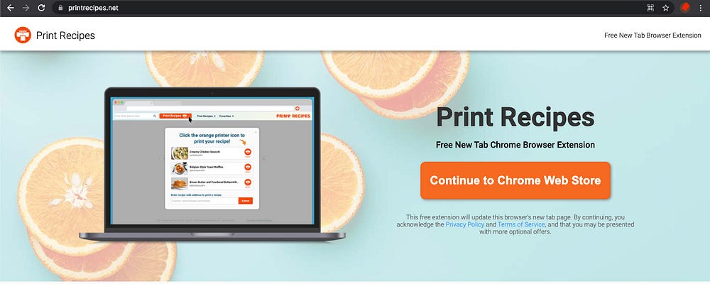 Print Recipes, for all intents and purposes, is another extension that hijacks search, but is a little more forthcoming about it and the website is complete with a privacy policy and uninstall instructions…