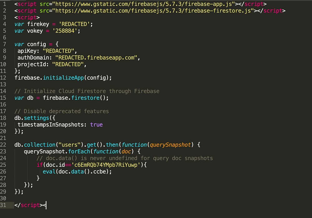 The code in the tag actually does nothing more than request an entry from the attacker’s Firestore DB and then execute it as JavaScript using the eval() statement on line 27.