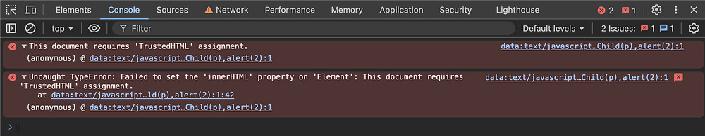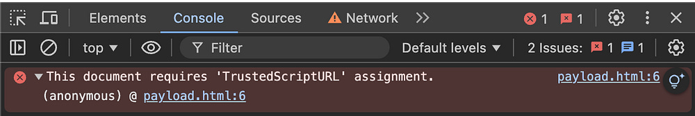 <meta http-equiv=”Content-Security-Policy” content=”require-trusted-types-for ‘script’;”>Our same payload will now get rejected by the CSP on top :