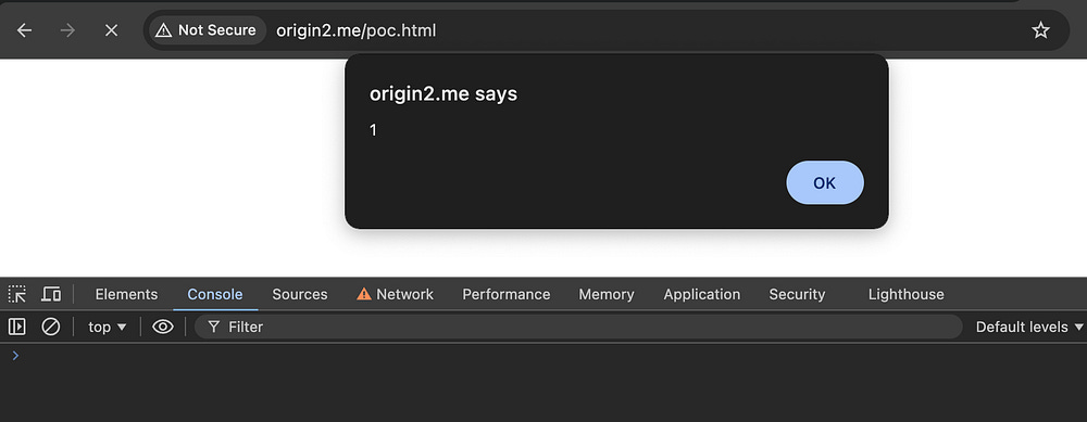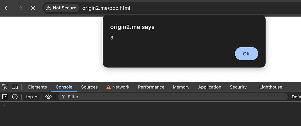 We wanted to test one more thing though, given that the MutantBedrog payload is multi-stage and includes the Trusted-Types voodoo in subsequent stages, even after successful injection to top. Here’s an updated payload that emulates this multi-stage strategy, but without subsequent Trusted Types policies: